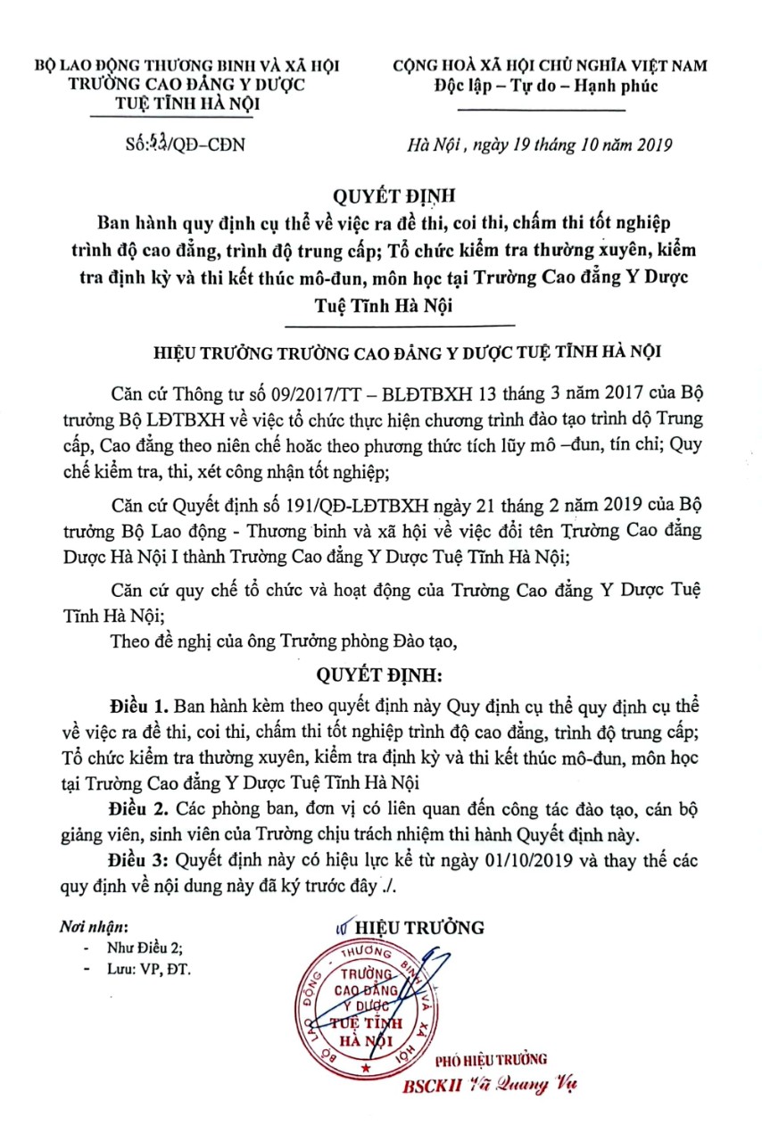 Quyết định ban hành Quy định cụ thể về việc ra đề thi, coi thi, chấm thi tốt nghiệp trình độ cao đẳng, trình độ trung cấp; Tổ chức kiểm tr thường xuyên, kiểm tra định kỳ và kết thúc module, môn học