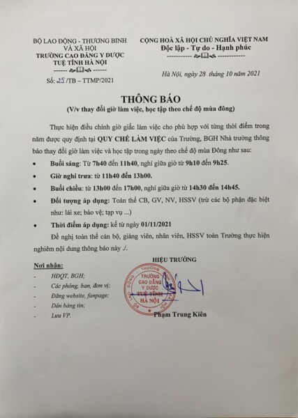 Thông báo Về việc Thay đổi giờ làm việc, học tập theo chế độ mùa đông