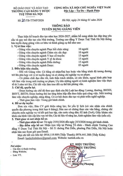 Chào mừng bạn đến với Cổng thông tin điện tử chính thức của Trường Cao đẳng Y Dược Tuệ Tĩnh Hà Nội ! Với vai trò như một trang tin nội bộ để phản ánh những thông tin, sự kiện nổi bật diễn ra trong hoạt động thường nhật của Trường, nên nhiều nội dung, hình ảnh, đề mục chưa đáp ứng được sự kỳ vọng của Quý độc giả, Quý Thầy cô và các bạn HSSV. Đồng thời, hiện tại Trang tin đang gặp phải một số vấn đề kỹ thuật, nên một số chuyên mục trên Trang bị lỗi và mất dữ liệu cập nhật. Nhà trường rất mong nhận được sự cảm thông, chia sẻ từ Quý độc giả, Quý Thầy cô, các bạn HSSV và sẽ cố gắng khắc phục tình trạng này trong thời gian sớm nhất. Trường Cao đẳng Y Dược Tuệ Tĩnh Hà Nội – Khẳng định sự khác biệt về chất lượng đào tạo của một trường chuyên ngành.