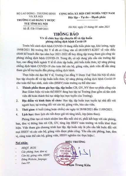 Thông báo về việc tổ chức học tập huấn chuyên đề và tập huấn phòng chống dịch bệnh Covid -19