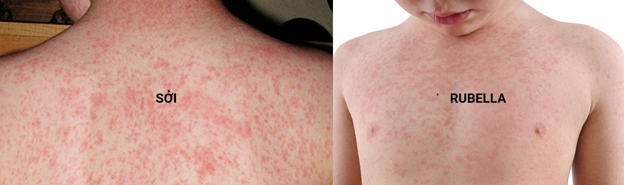 - Sốt phát ban do virus rubella: Phát ban màu hồng ở trên đầu, mặt, rồi mọc khắp toàn thân nhưng thường không tuần tự như bệnh sởi, thời gian phát ban kéo dài trong khoảng 3 ngày. Ban do virus rubella phát ra dày dặc hơn ban do virus sởi. Trẻ có thể có dấu hiệu kèm theo như sưng hạch sau tai, hạch cổ, một số trẻ sẽ có triệu chứng đau khớp. Tình trạng sốt phát ban ở trẻ này được xem là lành tính, không gây ra biến chứng nguy hiểm ở trẻ như sốt phát ban do virus sởi.
